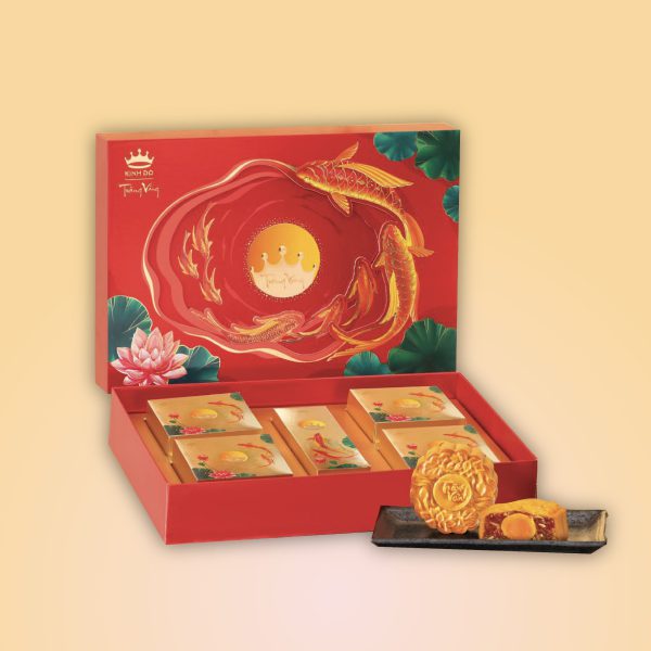 Bánh trung thu hoàng Kim đỏ là món quà gói gọn lòng trân quý. Tthiết kế của trăng vàng Hoàng Kim đỏ đầy tinh tế với những nét họa tiết mềm mại trên nền đỏ thắm, làm nổi bật Hoàng Kim vương giả. Ẩn chứ bên trong là hương vị độc đáo của thịt sốt tương BBQ, Gà quay tứ quý, Tôm càng bách hoa. Đó là cả công trình người nghệ nhân Trăng vàng dày công tạo dựng và chăm chút: mênh mang mà đậm đà vị biển, chan chứa mà thấm đẫm nghĩa tình bạn bè trao tặng nhau. Gửi gắm lời chúc thành công, ghi dấu một thu thành đạt, rạng rỡ vinh hiển.
