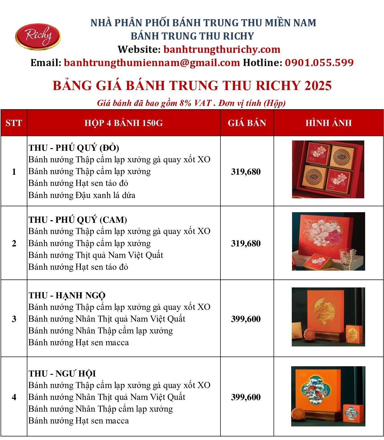 Sau đây là bảng giá bánh trung thu Richy 2025. Bánh được bán theo hộp sẵn. Nhận đơn hàng cơ quan, xí nghiệp, doanh nghiệp. Đặc biệt, có thêm chiết khấu ưu đãi khi mua hàng tại nhà phân phối bánh trung thu miền nam. Liên hệ trực tiếp 0901.055.599 (có Zalo) để được tư vấn, báo giá nhanh nhất.