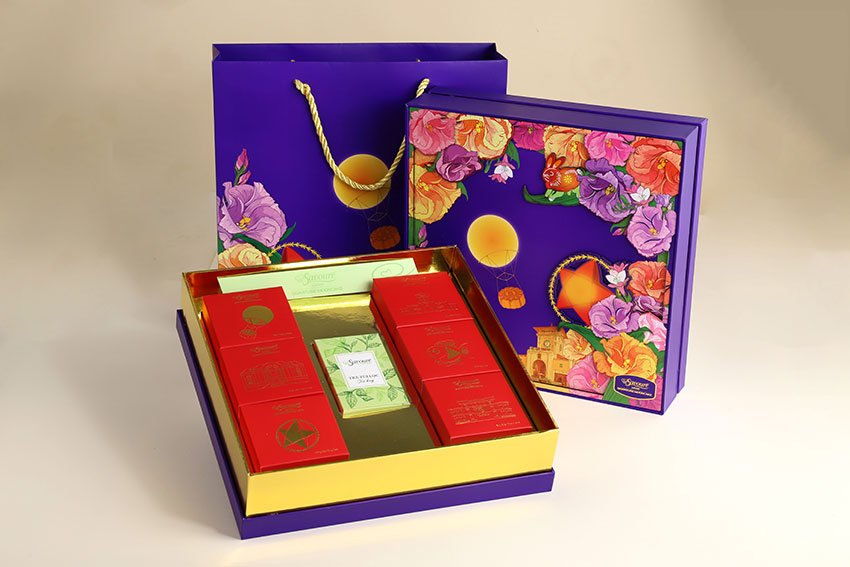 Mẫu hộp Savouré có thiết kê sinh động nhiều màu sắc, nhận in logo doanh nghiệp với số lượng từ 100 hộp trở lên